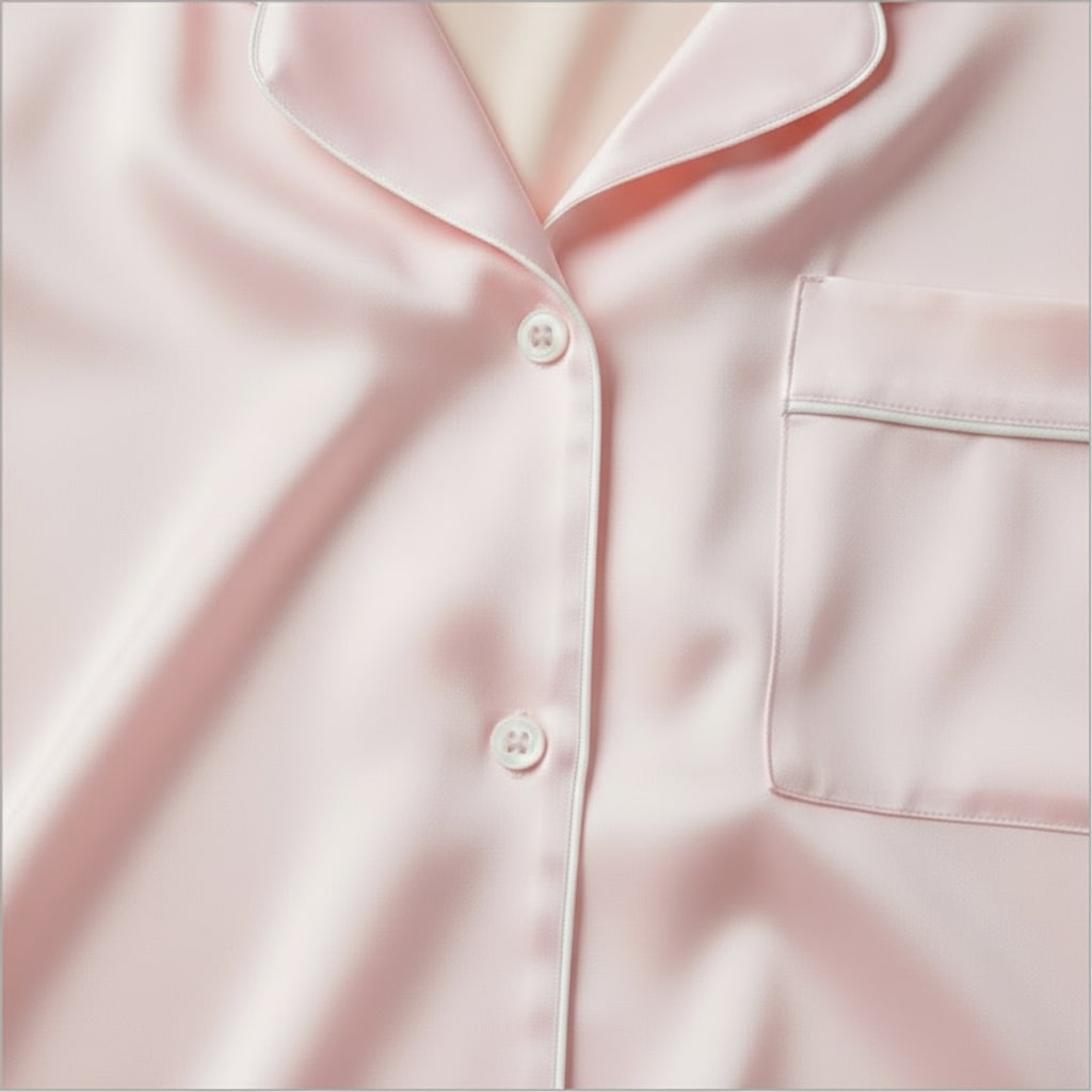 Unser hugged™ Satin Signature Set ist weich wie eine Umarmung, atmungsaktiv und fließend geschnitten. Mit edler Akzentnaht, klassischem Button-up und elastischem Bund – ein echtes Self-Love-Piece.